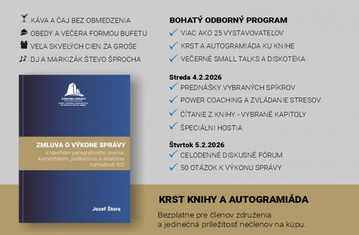 Prijmite pozvanie na IV. ročník celoslovenskej konferencie EFEKTÍVNA SPRÁVA 2026, ktorá sa bude konať 4.- 5. februára 2026 v Bratislave. Nezabudnite sa včas prihlásiť a rezervovať si ubytovanie. Stretnete viac ako 25 vystavovateľov, dozviete sa konferenčné novinky, užijete si netradičný netradičný program. Tešíme sa na Vás.